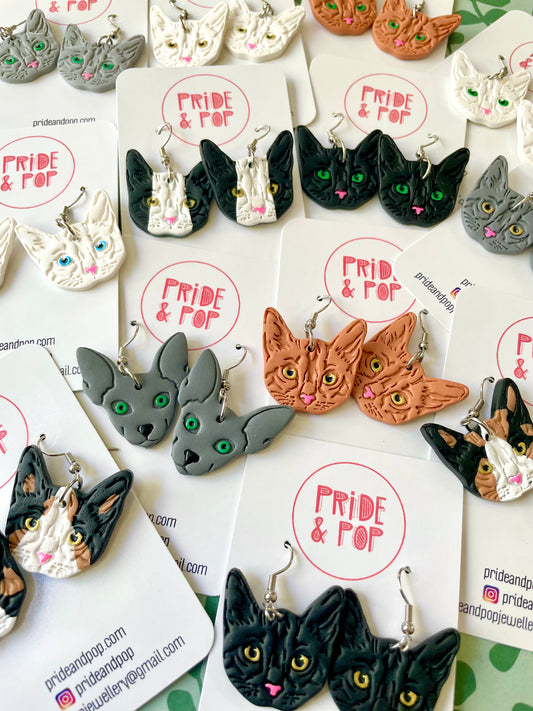 Custom Coloured Cat Earrings, Keychains & Magnets