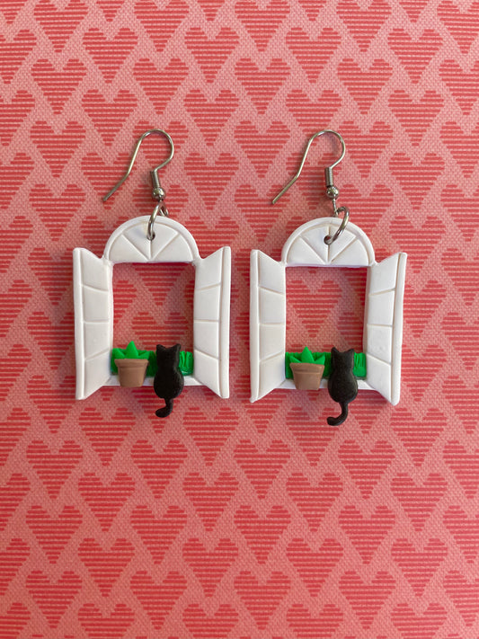 Black Cat in a Window Dangle Earrings